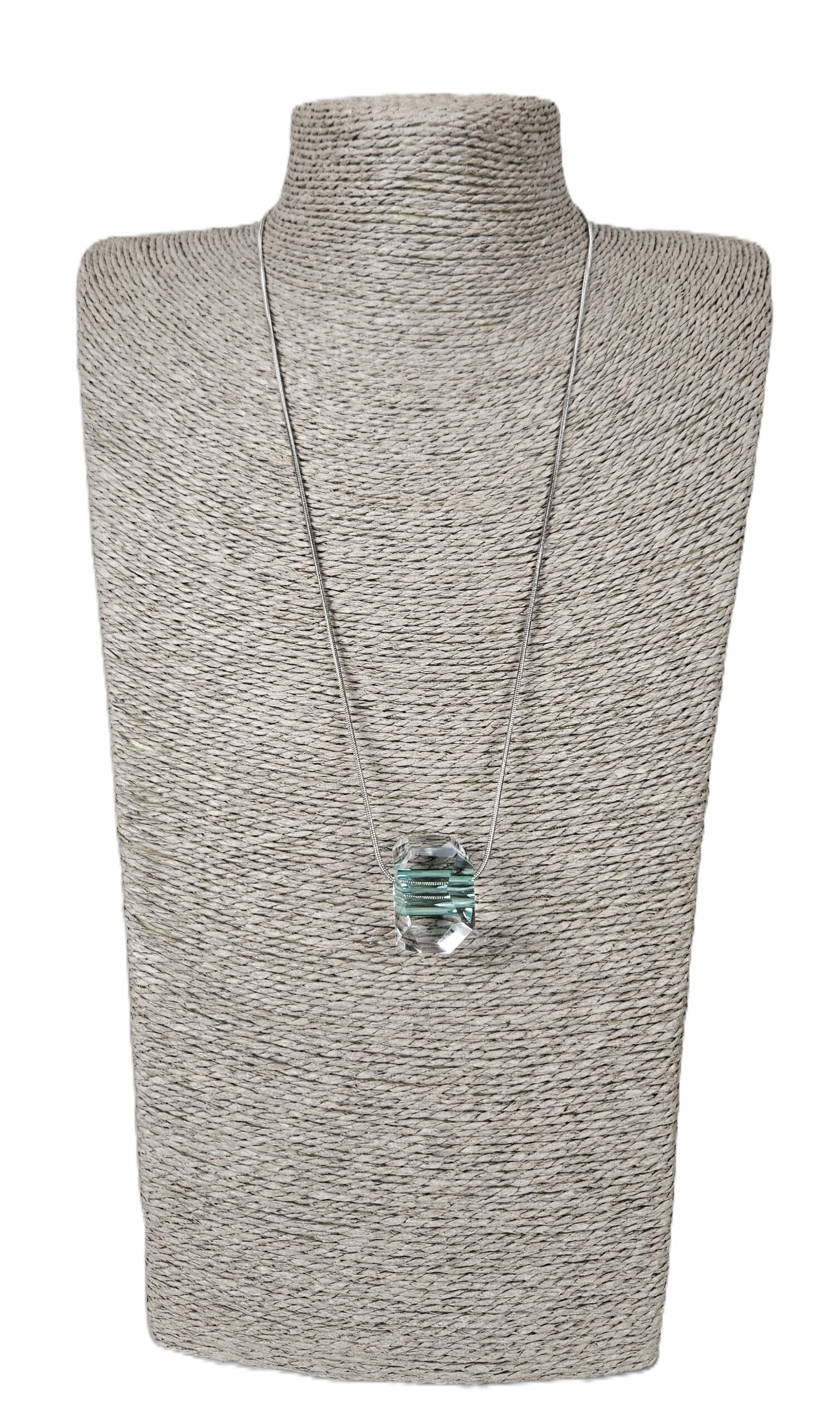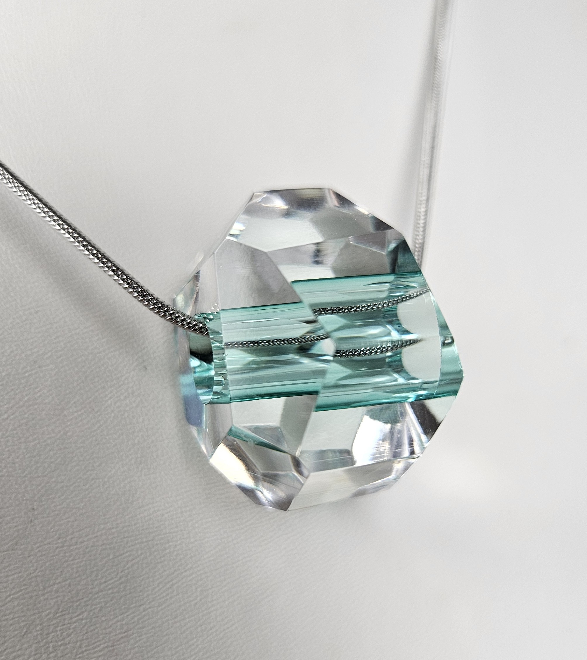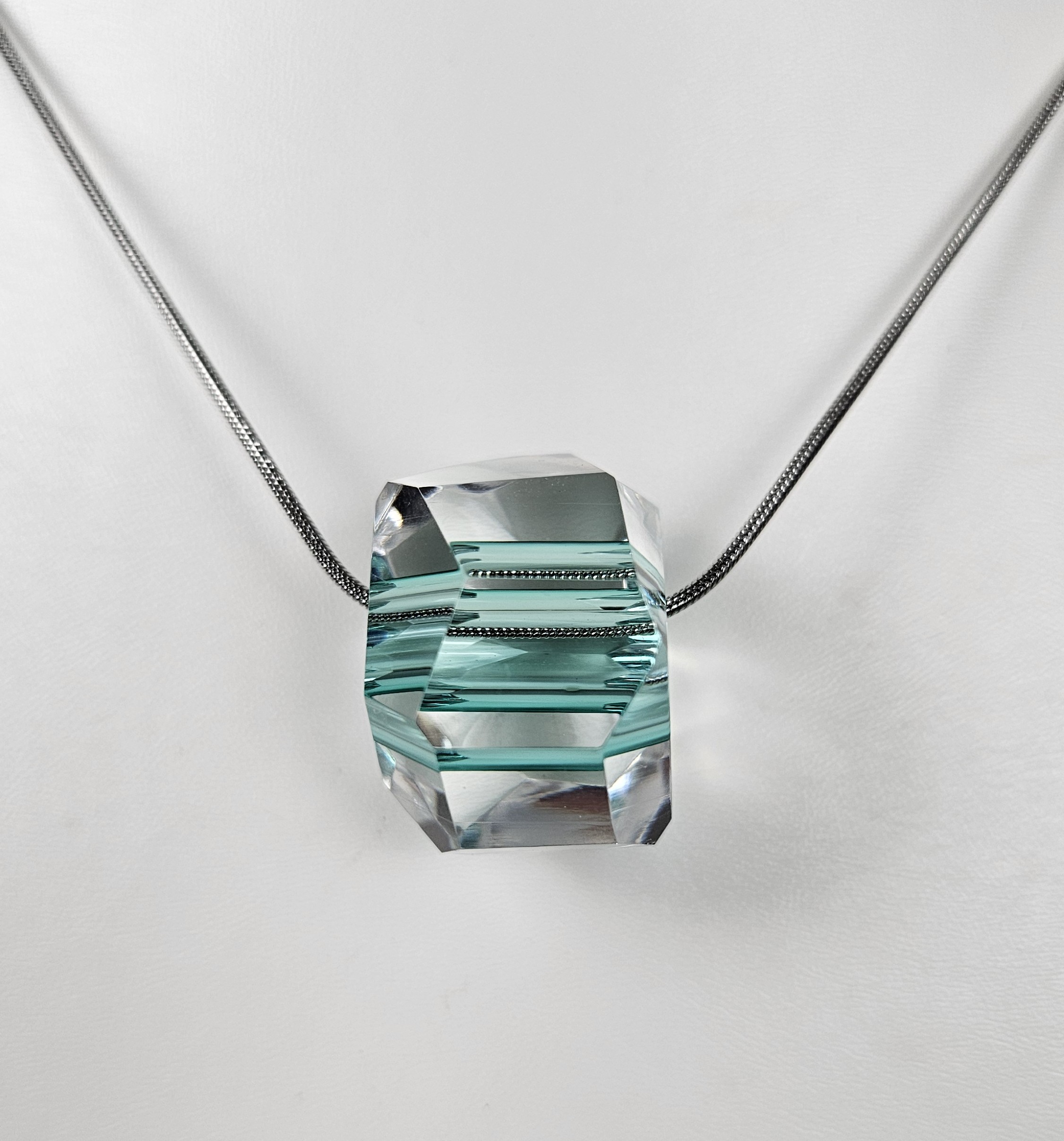 Ručně broušená křišťálová válec s hladkými ploškami po obvodu. Náhrdelník je v sobě kombinuje jemně modrý odstín skla s čirým křišťálem. Kovový řetízek zaručuje bezpečné nošení a dá vyniknout skleněné ozdobě. Jedinečnost autorského šperku je vidět na první pohled.
