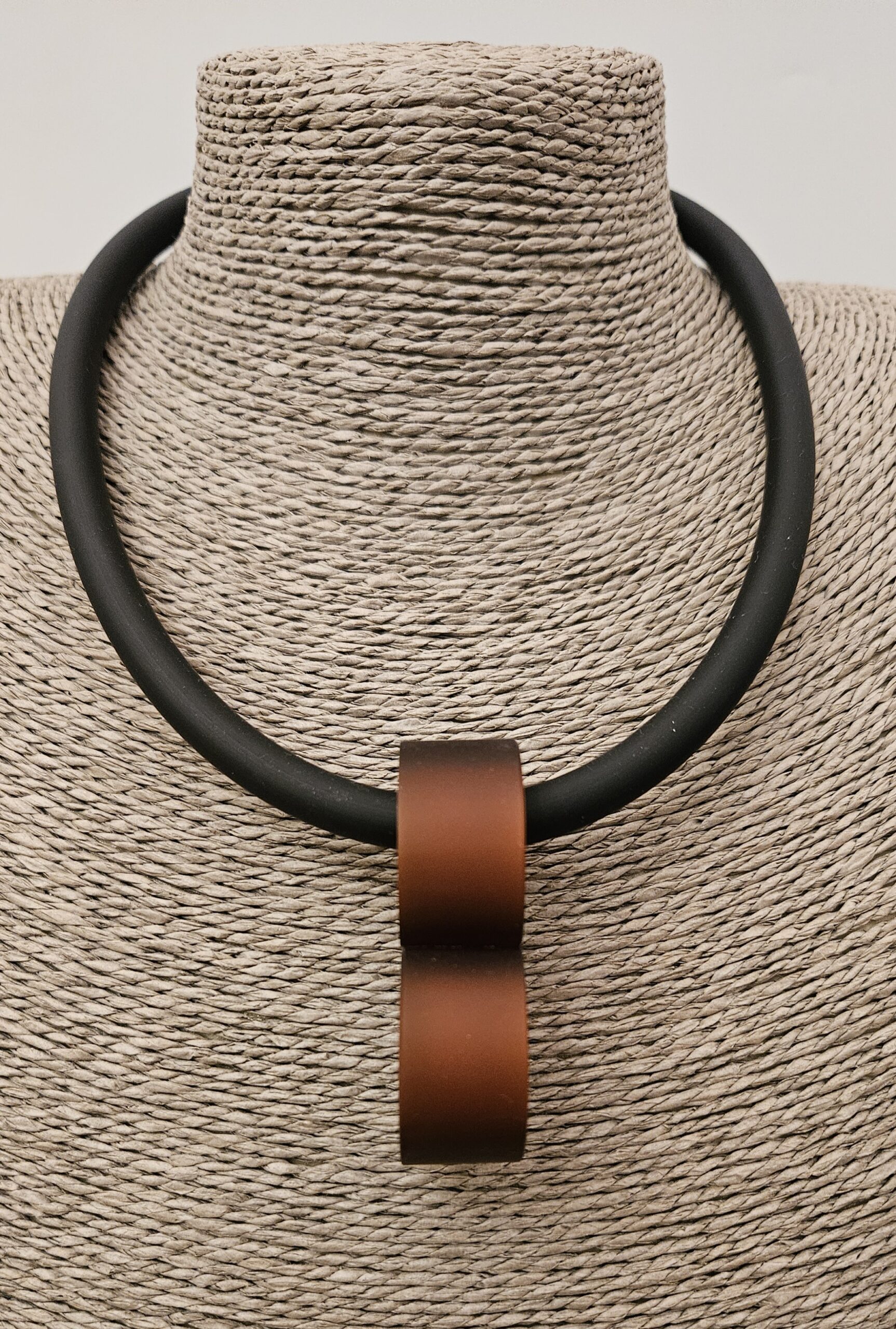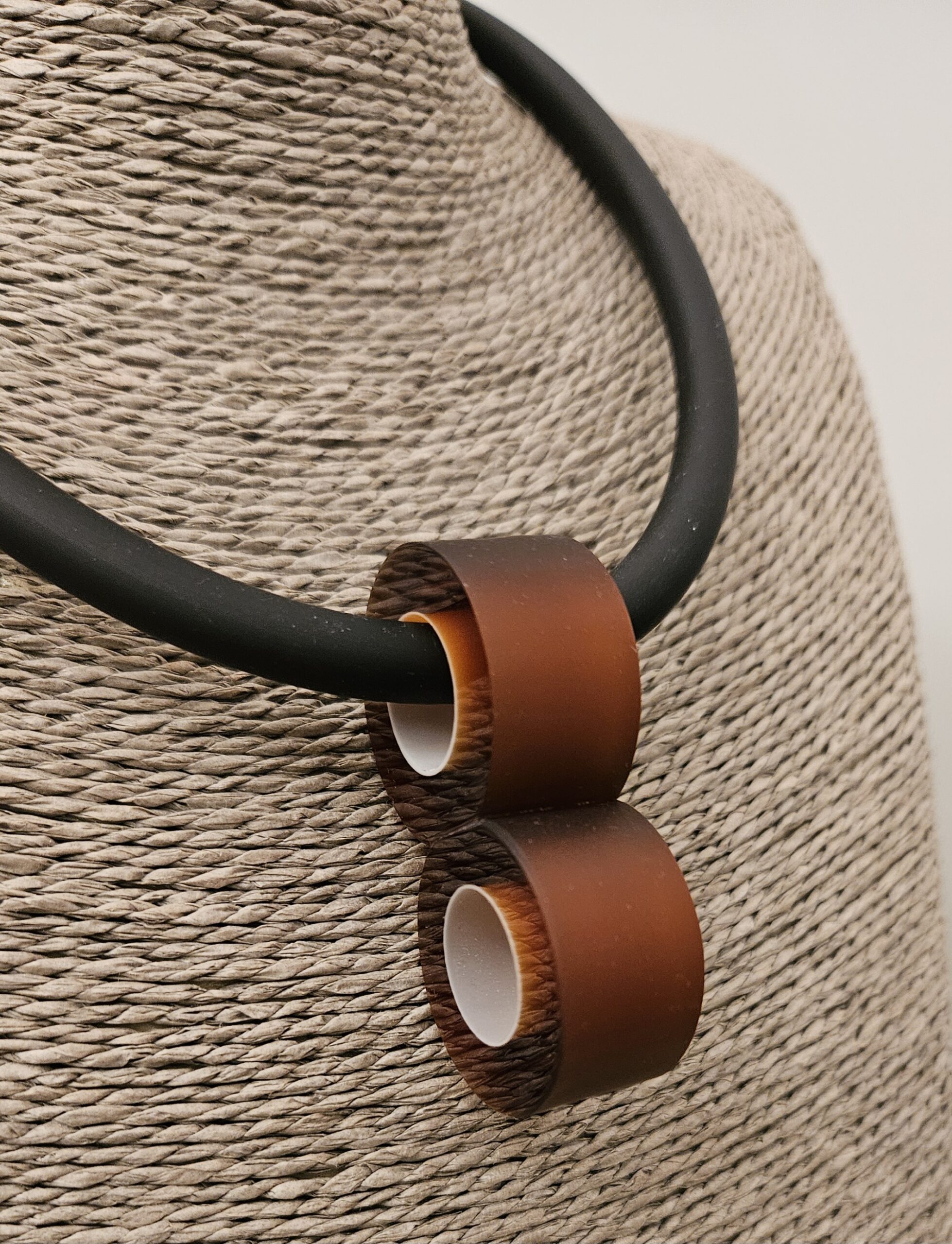 Ručně broušený skleněný šperk ve tvaru osmičky z hnědého skla, uvnitř bílé. Po obvodu je šperk matován, ze stran je vybroušen do hladkých ploch. Silikonové, neprůsvitné, lanko se velmi dobře doplňuje s barvou šperku. Jedinečnost autorského šperku je vidět na první pohled.