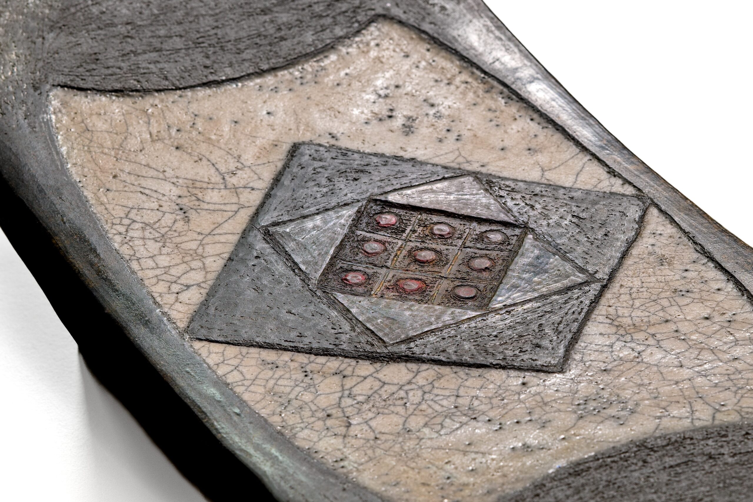 Interiérová keramická plastika „Lavička“ výtvarnice Jany Krejzové.