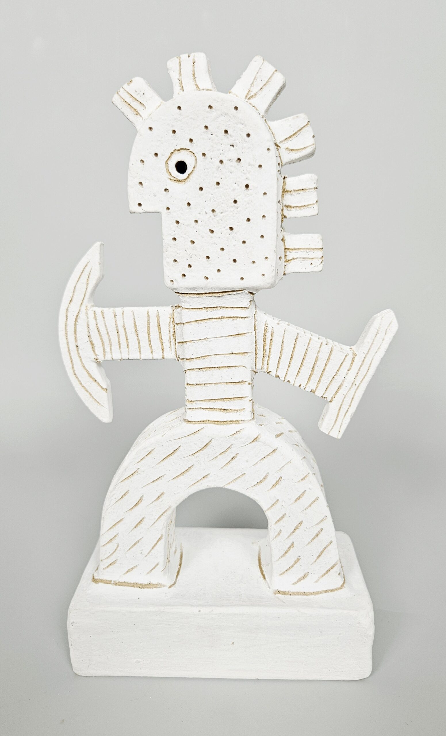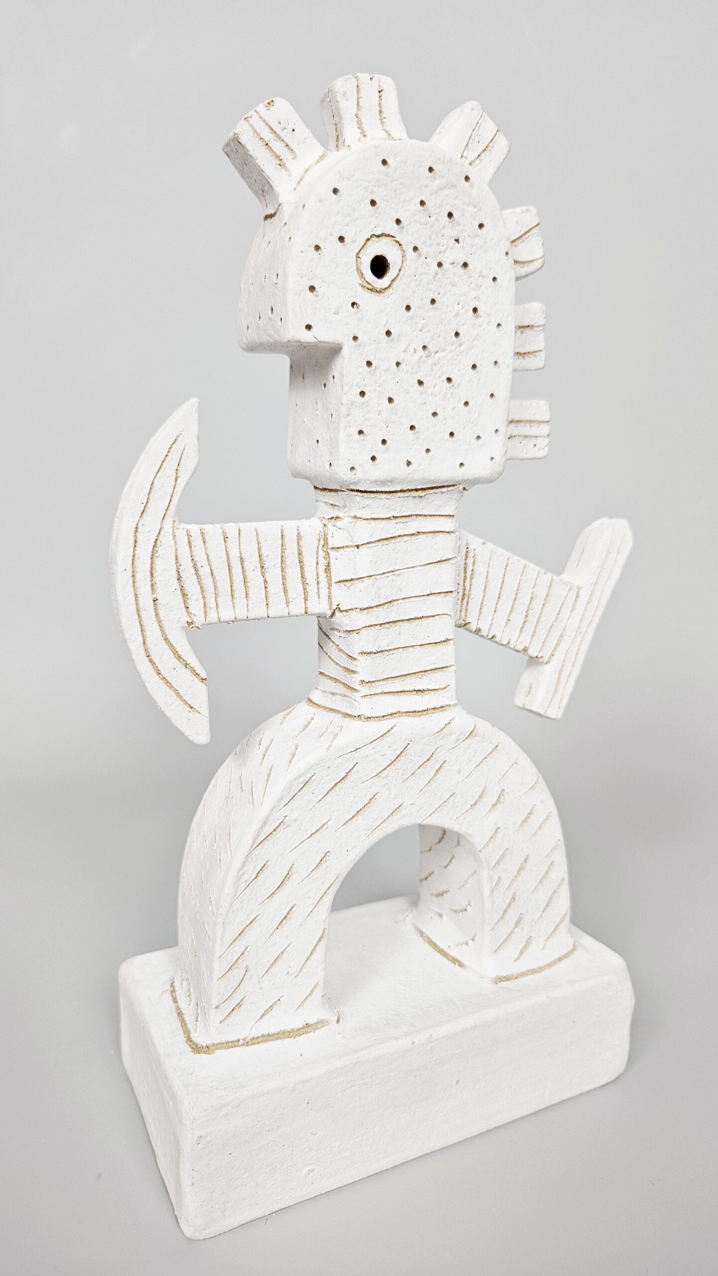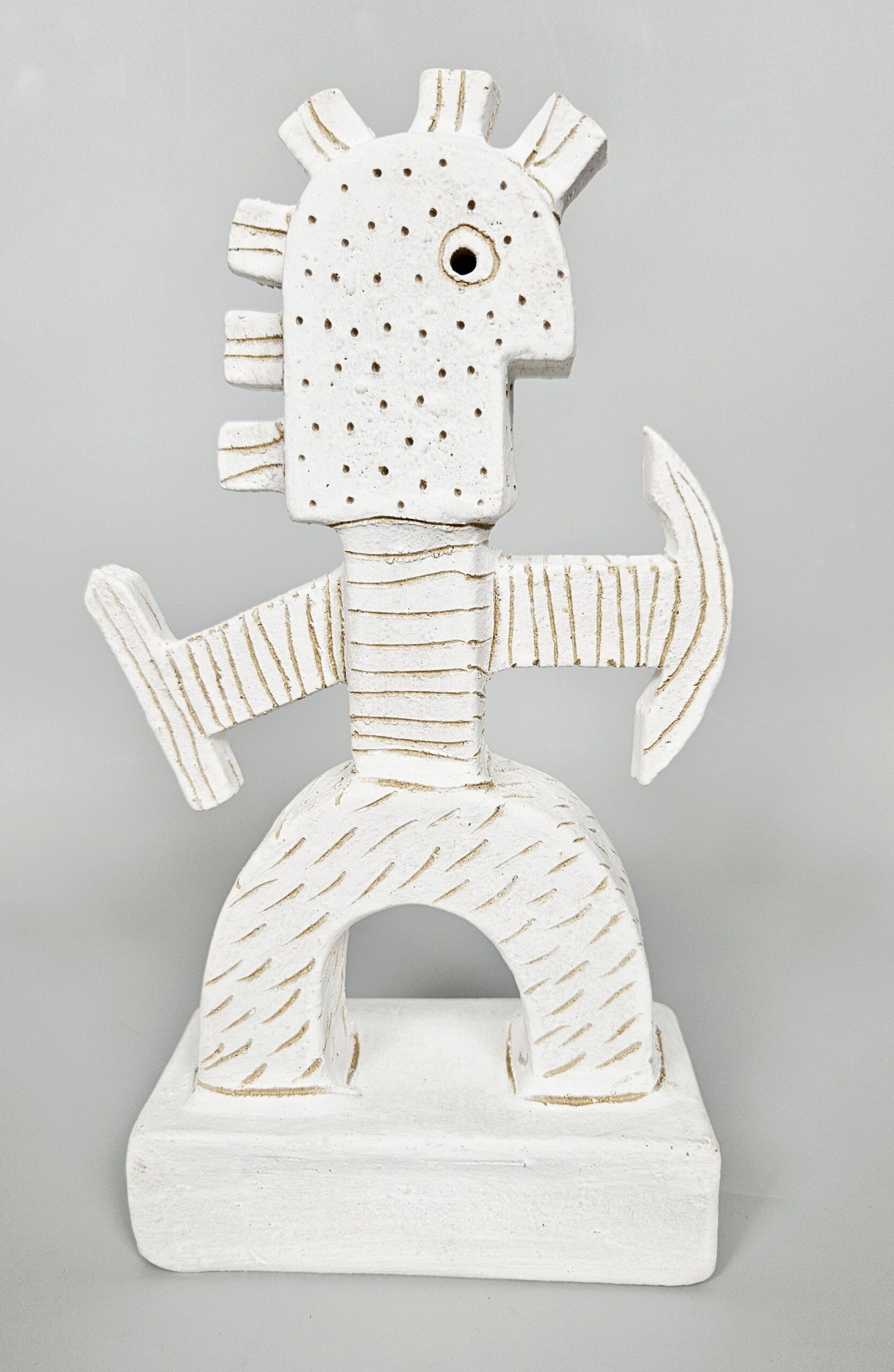 Plastika z keramiky s názvem „Válečník“ je ruční tvorba výtvarníka Karla Frantela a je inspirována skalními kresbami našich předků.