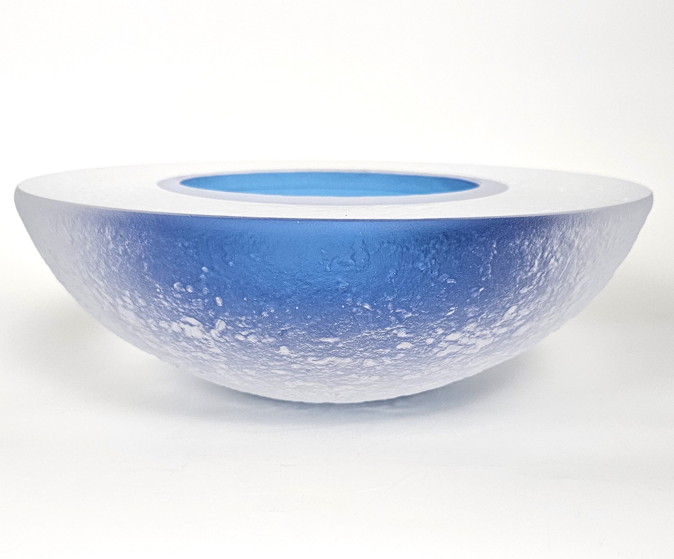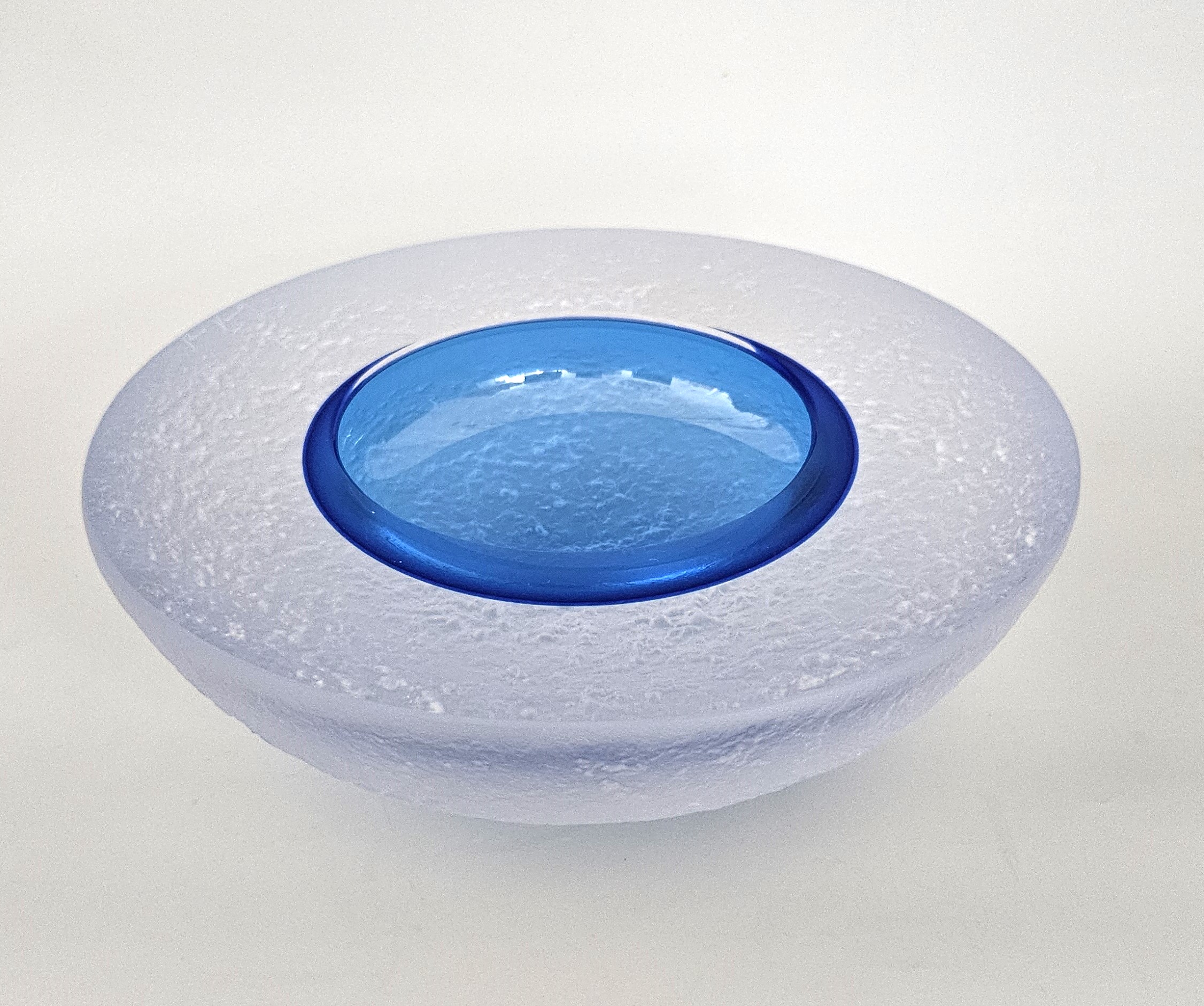 Křišťálová mísa v kombinaci s kobaltově modrou barvou uvnitř mísy je po vnějším obvodu leptaná.