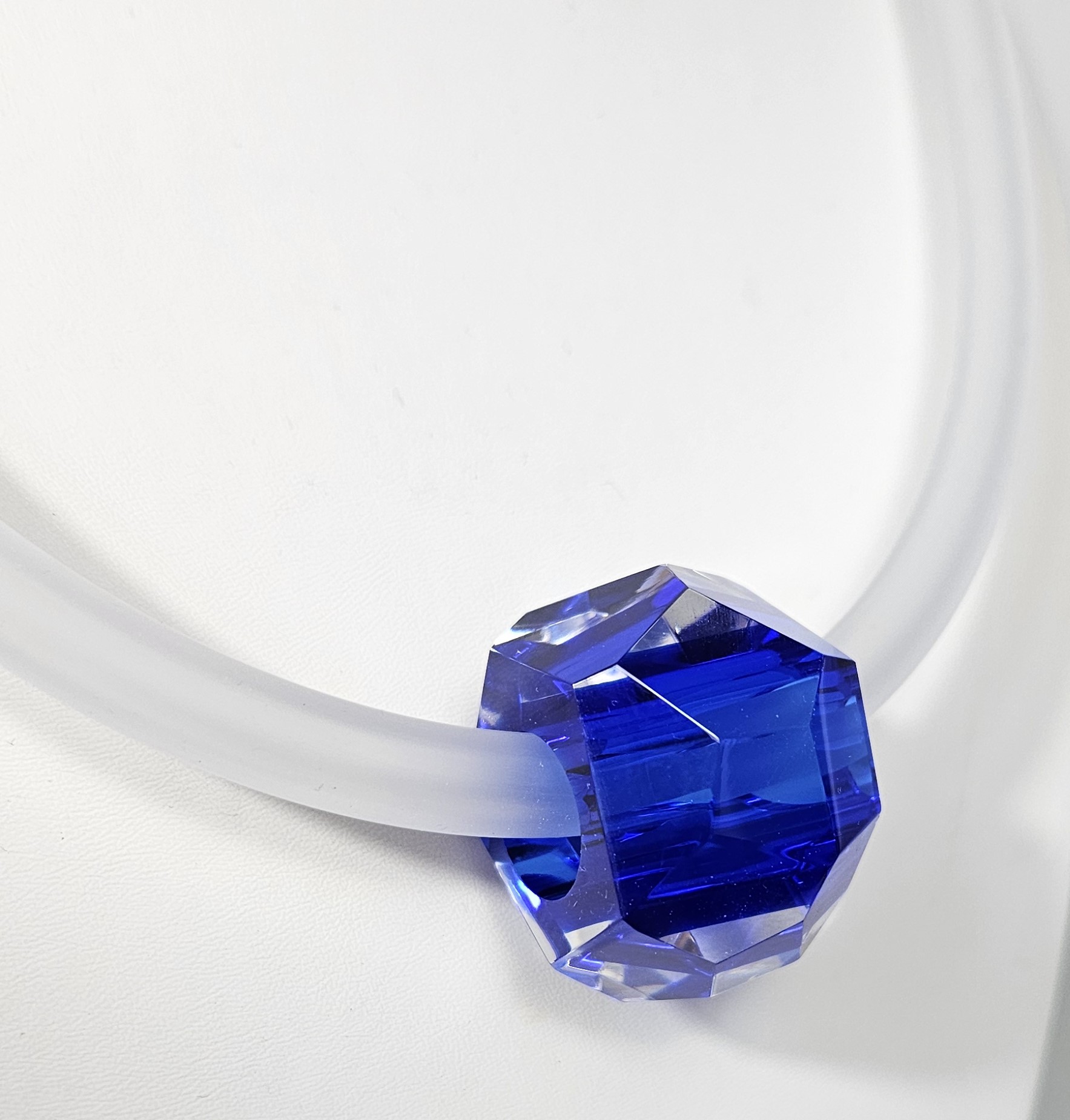 Ručně broušený náhrdelník s nepravidelnými ploškami v kombinaci královské modré barvy skla a čirého křišťálu. Plošky náhrdelníku umožňují hru barev. Náhrdelník je na silikonovém lanku, které je velmi lehké a příjemné na nošení. Zároveň dává vyniknout ojedinělé skleněné ozdobě. Jedinečnost autorského šperku je vidět na první pohled.