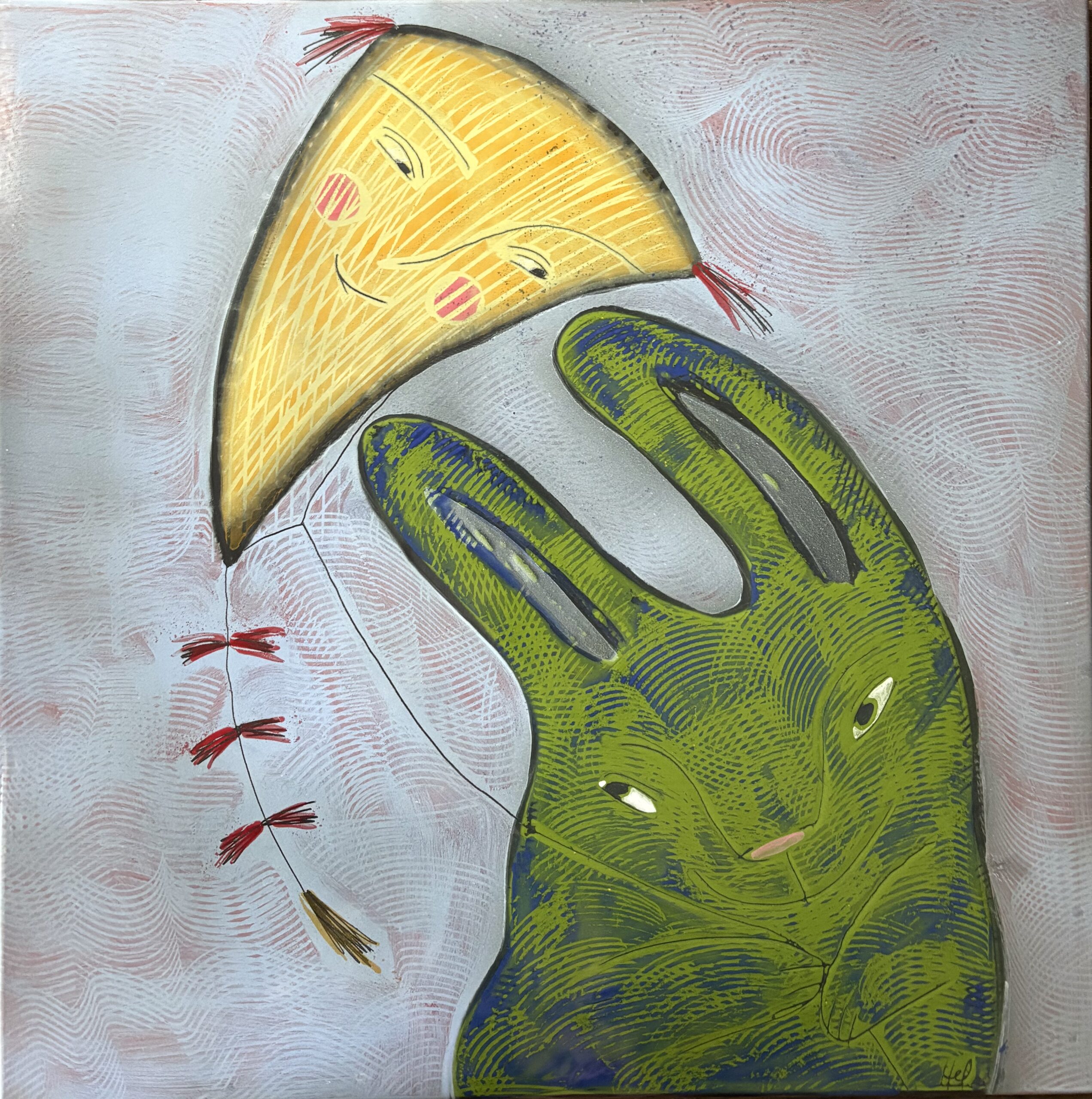 Obraz „Zajíc a drak“ ze smaltu výtvarnice Heleny Hlušičkové.