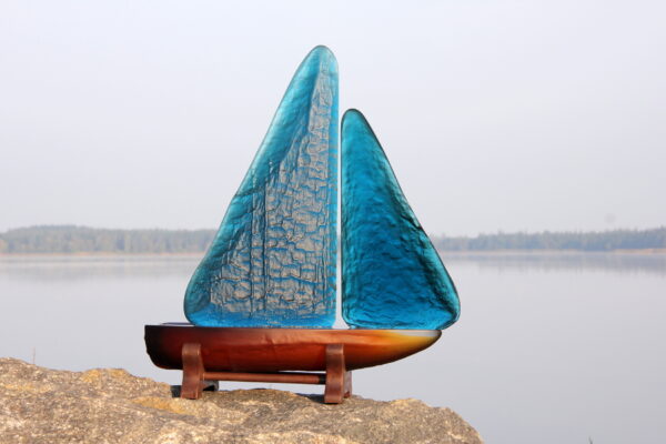 Unikátní skleněný objektu ve tvaru plachetnice je výjimečný na první pohled. Kombinace matovaného skla s plochami broušenými do vysokého lesku dává pocítit mořský vánek.