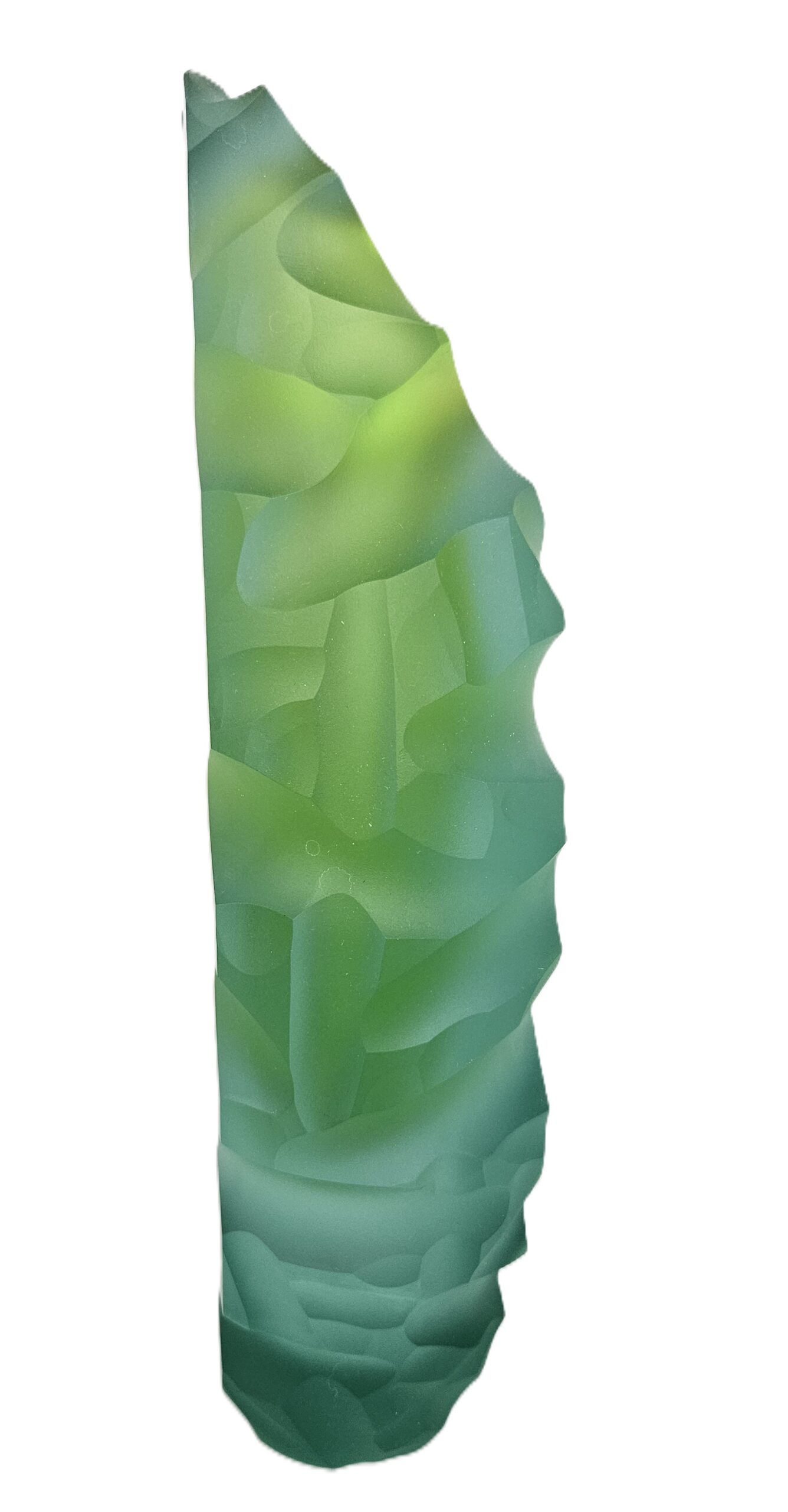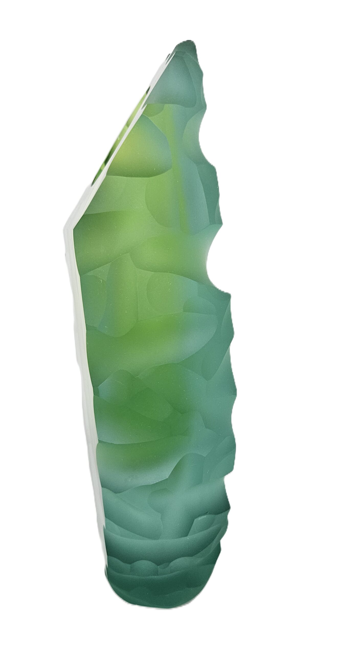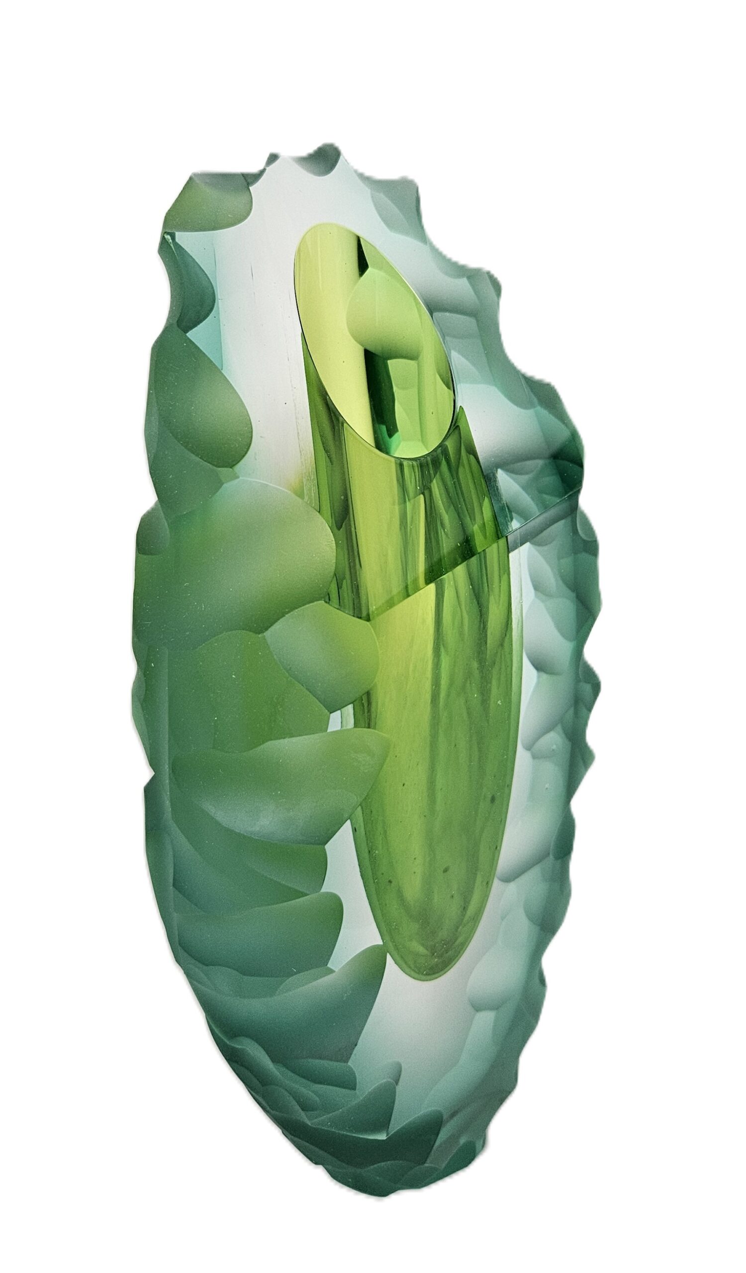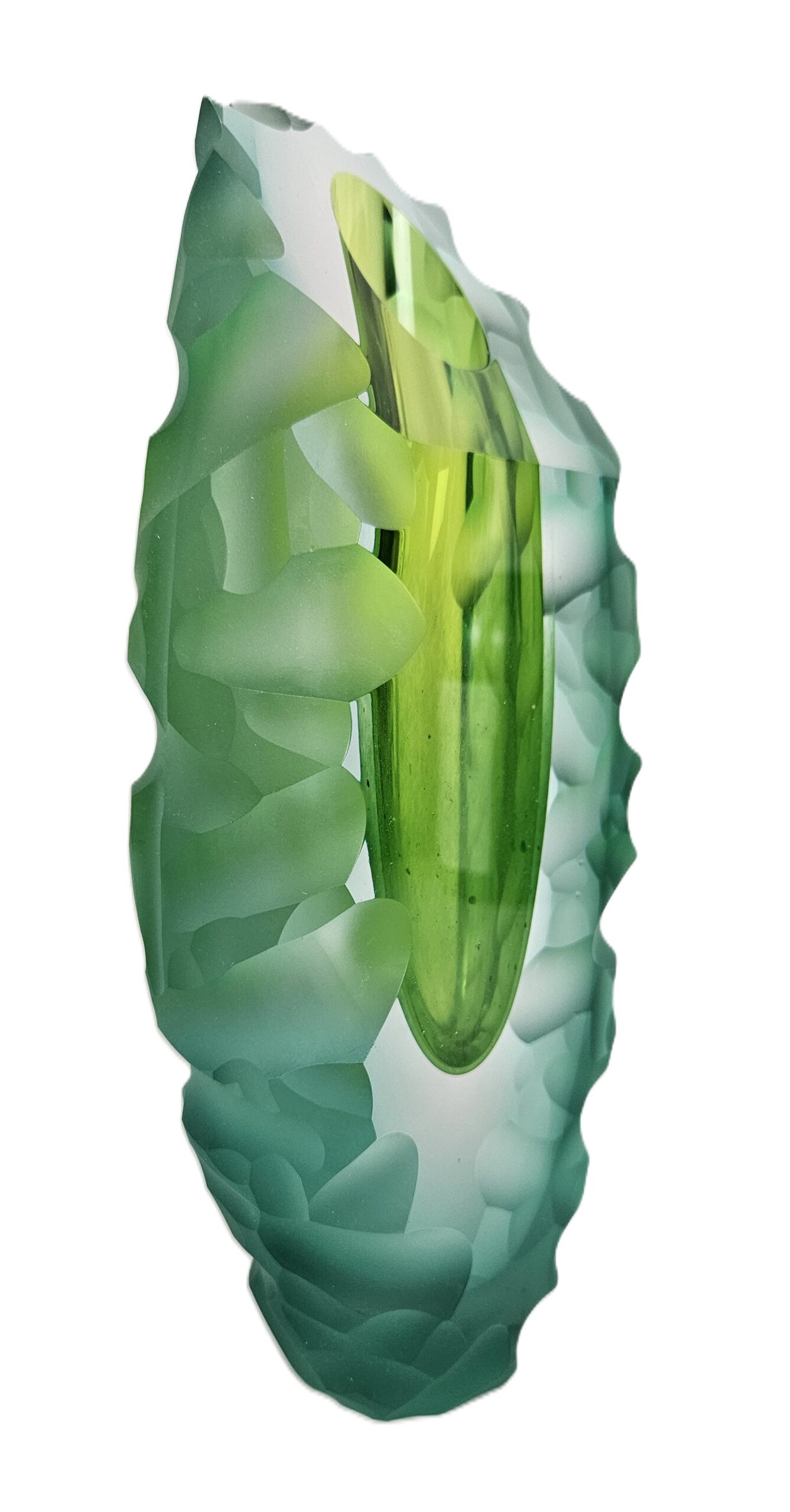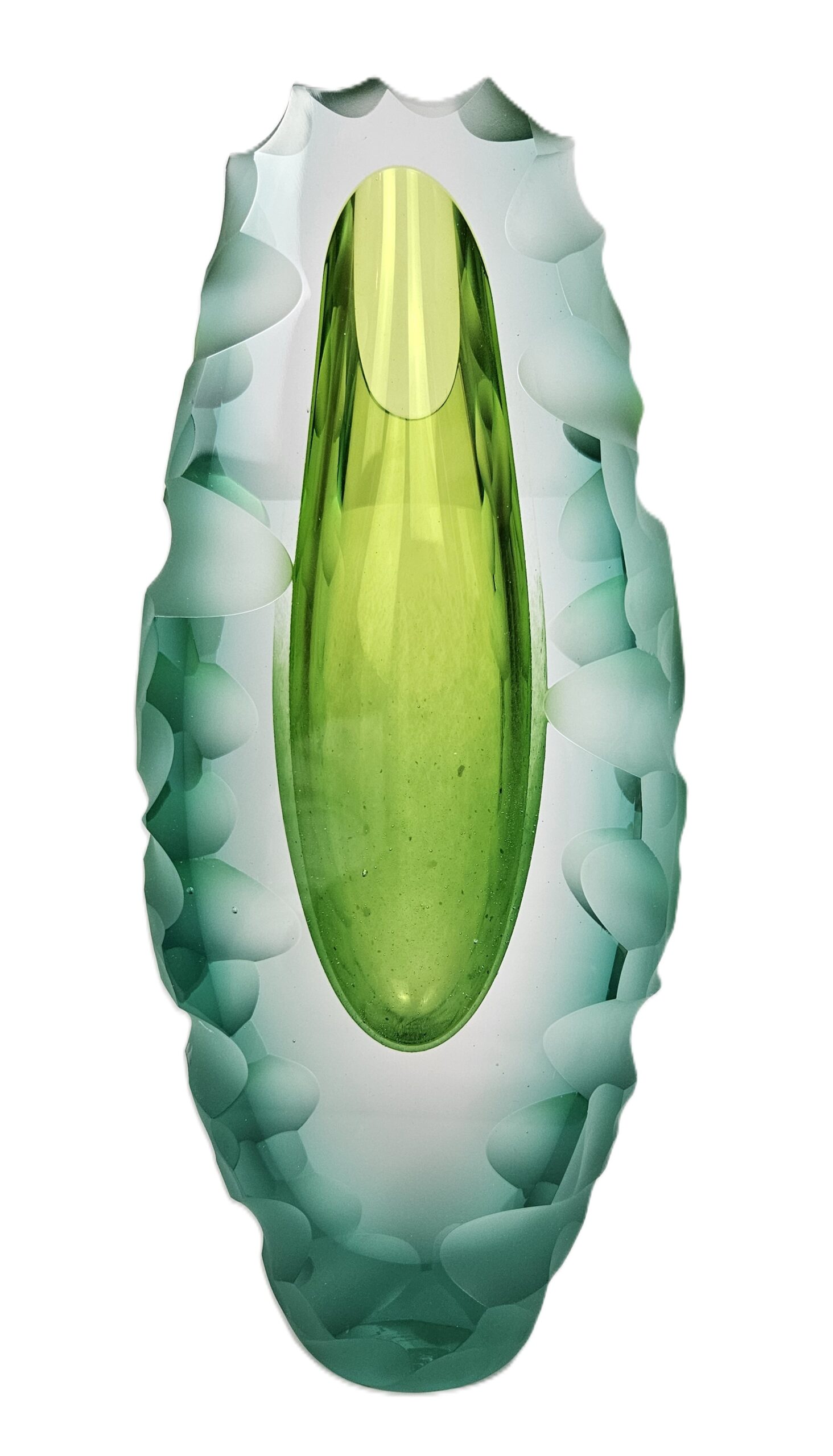 Ručně tvarovaná broušená váza v odstínech zelené a čirého křišťálu z hutního skla.