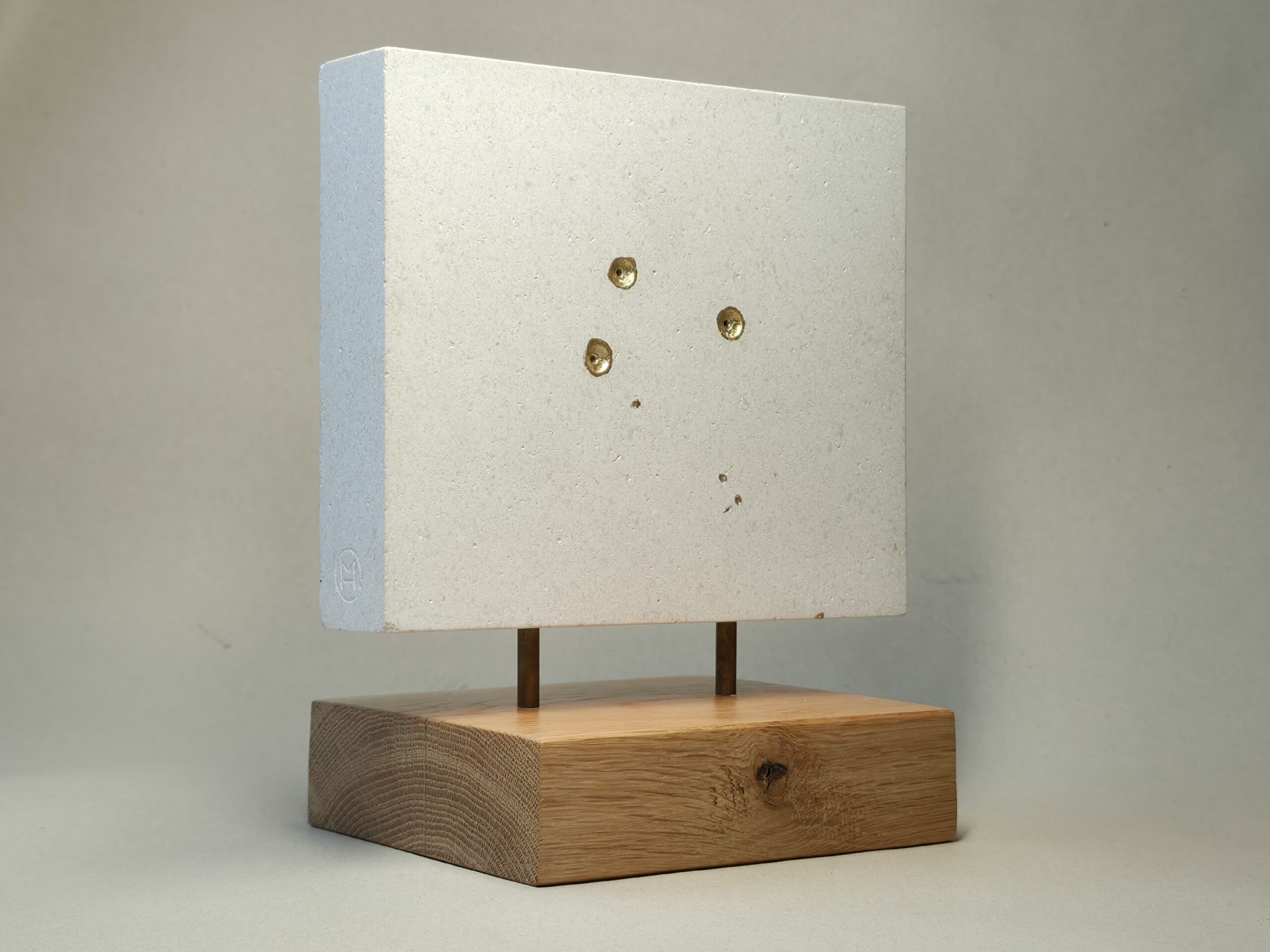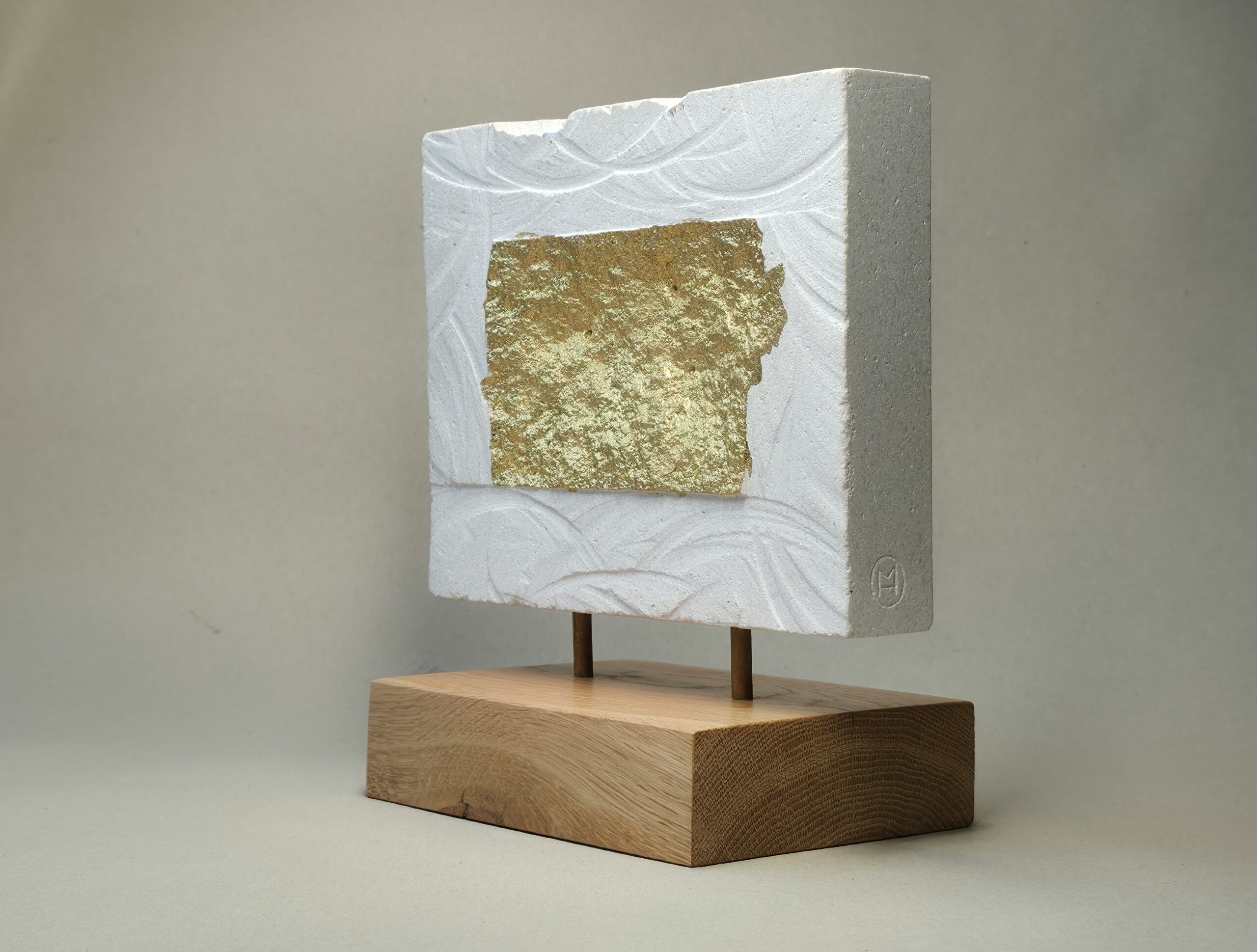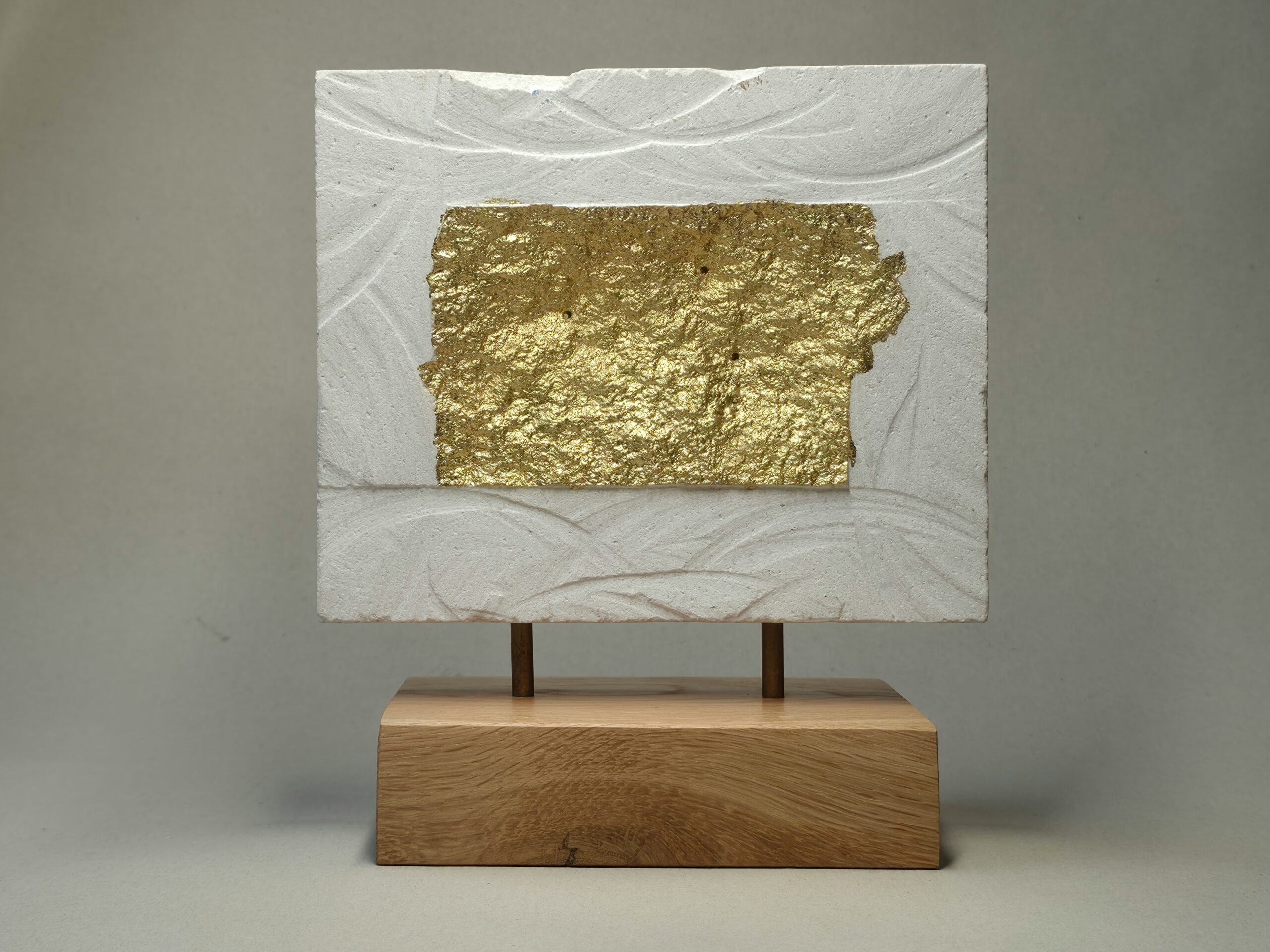 2026,18×11,5x21cm, vápenec, plátkové zlato 23K, dub, mosaz, železo